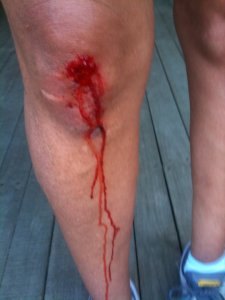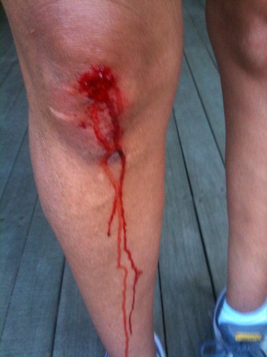 About a mile from my house, I hit a rough patch of sidewalk, which caught my quirky foot just right, causing me to yard-sale off of a busy street. I ended up with some scuffs, bruises, and a bloodied up knee; I kept running though.