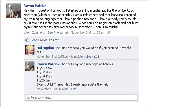 I hopped on Hal Higdon‘s Face book page and posed the question. I figured that if anyone knew the answer, he sure would! His training schedules are the backbone of most, if not all Marathon training.