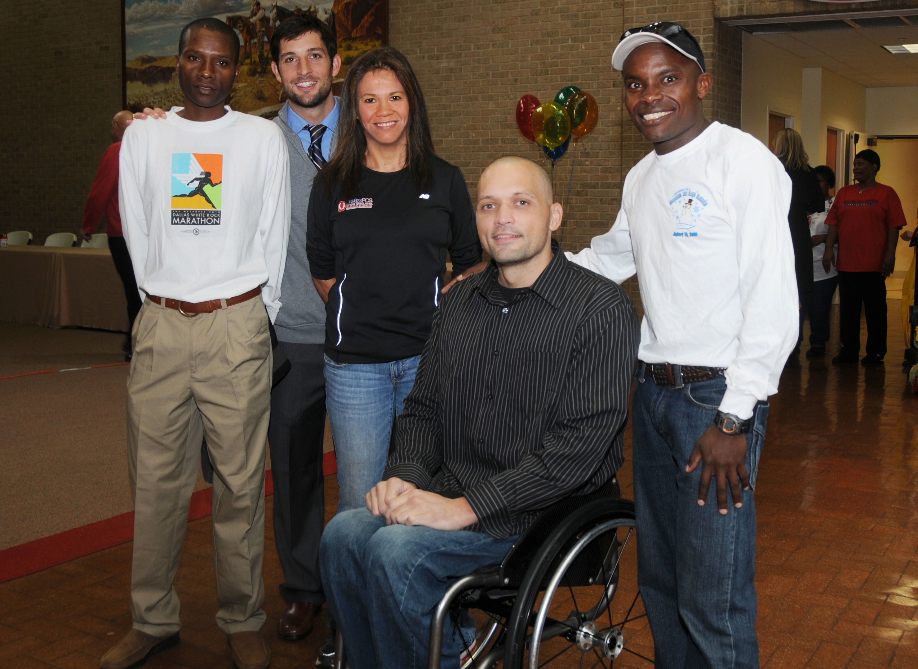 DWRM Tshirt Visit_05a Published December 8, 2011 at 2961 × 2158 in Why We Run The Dallas White Rock Marathon Elite Runners – Fred Mogaka, Logan Sherman (Parker University), Raven Patrick (former patient), Justin Meaders, Benard Langat